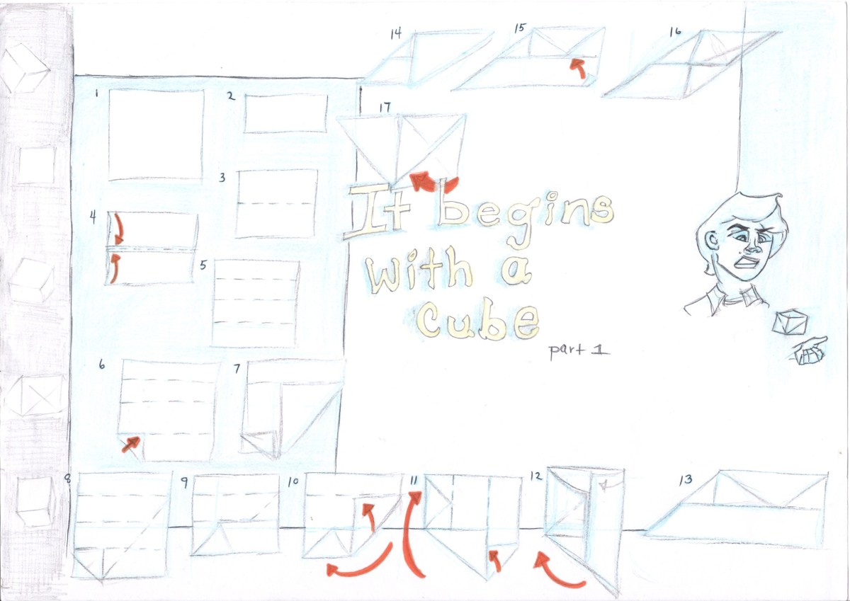 Sitting with a piece of paper the same length and width to depict the shaping of a 6 part cube by the folds of one. This will certainly take a time to come up with the entire 3x3x3, So happy to have gotten this far :). The characters face looks how I felt looking up the appropriate way to form the cube and watching the video over and over to make sure it was done properly.