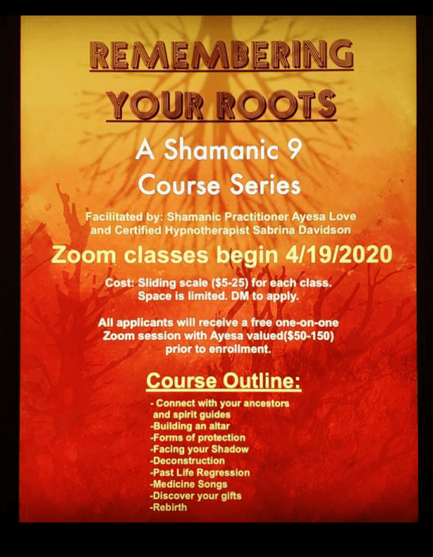 Remembering Your Roots was a class series organized by shamanic practitioner and artist Ayesa Munguia and myself. I am an advocate for progressive relaxation and meditation as a spiritual and mental health tool and whole heartedly believe discovering your own spiritual understanding helps to transform your life into one that is authentic and beautiful.